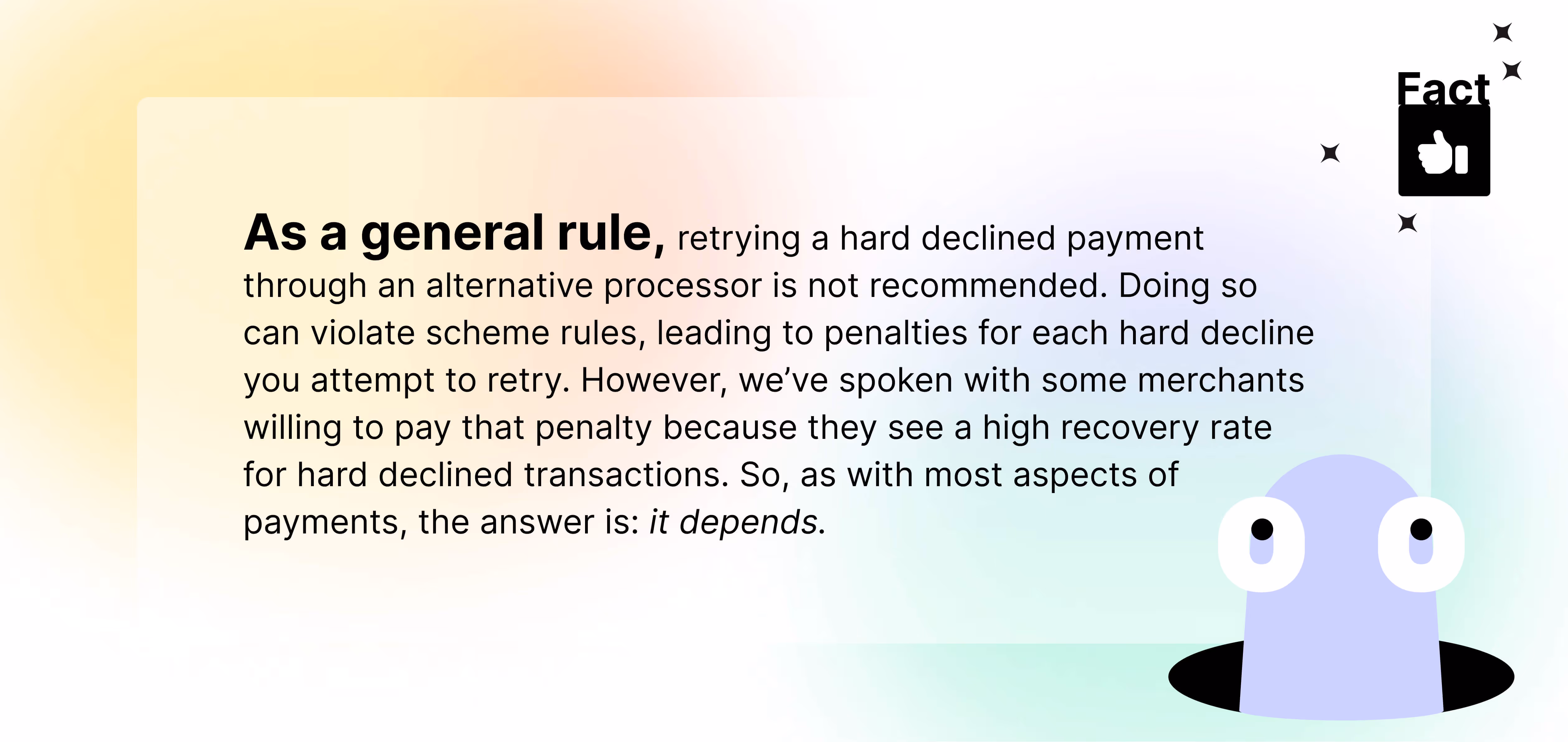 This balance is unique to every business. Some merchants choose to attempt fallbacks on every soft decline—and even hard declines, but this is not recommended—while others are more selective, retrying payments based on specific decline codes.