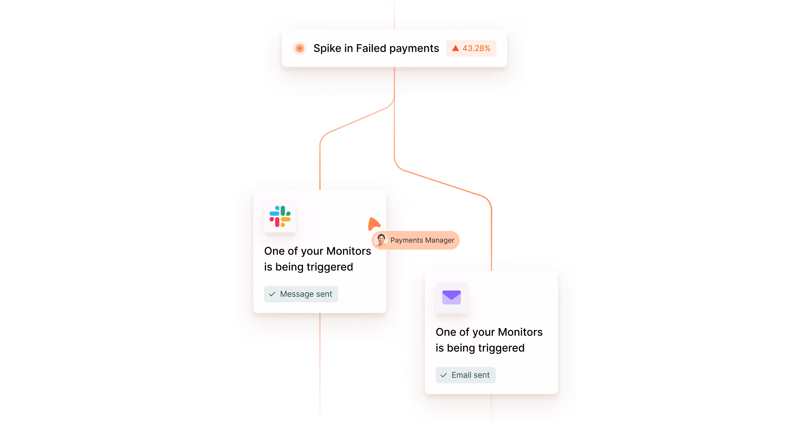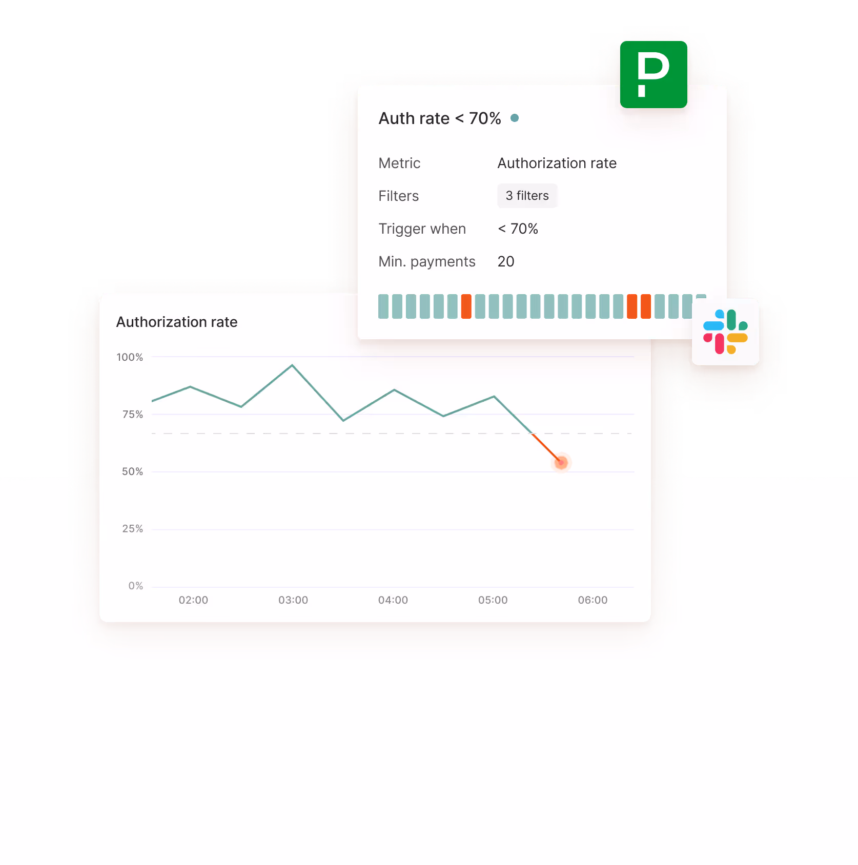 Stay ahead of issues before they become incidents. Monitors track your most important payment metrics in near real-time, so you can react to dips, spikes, or anomalies the moment they happen.